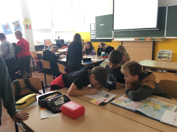 V Německu žáci zjišťovali informace o reáliích země, luštili křížovky, rozřazovali slova podle jazyků a sestavovali ingredience na eintopf.