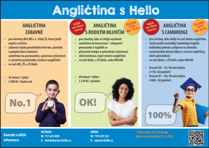Ve spolupráci s jazykovou školou Hello jsme pro ně připravili odpolední kroužky angličtiny, které spojují rozvoj jazykových dovedností a přípravu na prestižní zkoušky Cambridge s celoživotní platností.
