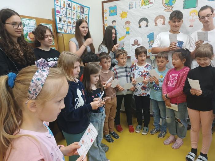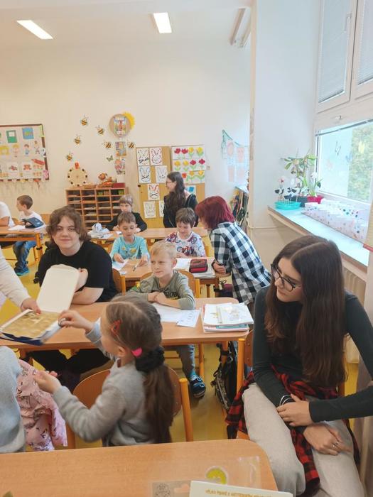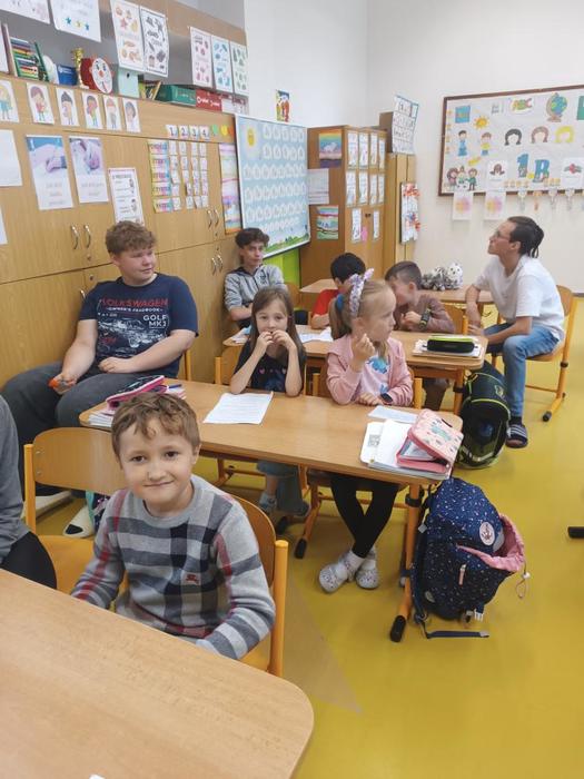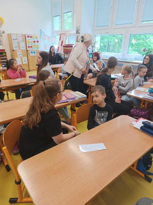 V listopadu 2024 se poprvé setkala 1.B s 9.A, nechyběly ani třídní paní učitelky Marcela Popalová a Irena Moroňová. Prvňáci poznávali první písmenka, zkoušeli vytleskávat slabiky, učili se držet tužku. Deváťáci přinesli pohádkové knížky a malým školákům četli pohádky.Společně namalovali obrázky. Kluci i holky z 1.B byli nadšeni a slíbili 9.A, že budou během celého školního roku pilně číst, učit se, aby na konci školního roku přečetli pohádku oni deváťákům. Povedlo se. 20.5. 2025 opět pozvali 9.A na návštěvu a s velkou chutí četli a četli. Zahráli si společně novou hru – Já mám, kdo má, nechybělo ani oblíbené Bingo. Taky jsme si zdřímli, probudil nás Budík – hláska L nebo Š. Vyvenčili jsme třídního pejska Alíka. Užili jsme si pěknou společnou hodinu ČJ. Paní učitelka Moroňová přinesla i sladkou odměnu. Děkujeme. 9.A přejeme úspěšný start v nových školách.